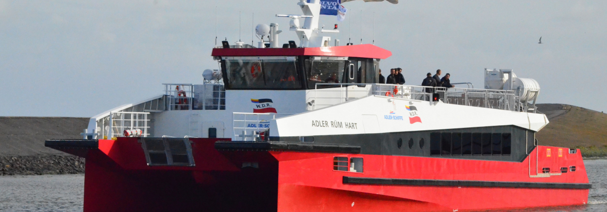 This article highlights the design considerations of this innovative, compact, lightweight, shallow draught and fast aluminium catamaran. It presents how the owners’ requirements, the embarking and disembarking possibilities of passengers and specific German Flag State Regulations led to the layout of the vessel. Another interesting feature was the development of the catamaran hull form to achieve a speed of 18 kn in the very shallow waters of the Northern German Waddensea with a limited amount of power.